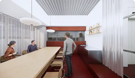 共用空間も充実しており、2階には入居企業専用の広々としたラウンジとダイニングを設置。