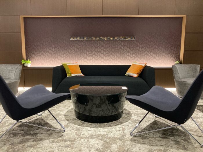 ホテルのラウンジのようにゆったりとしたビジネスラウンジ内は、広めのテーブルで資料を広げて打合せができるスペースや、ソファに腰かけリラックスして会話ができる場など、用途や気分にあわせてご利用いただける様々なスペースをご用意。